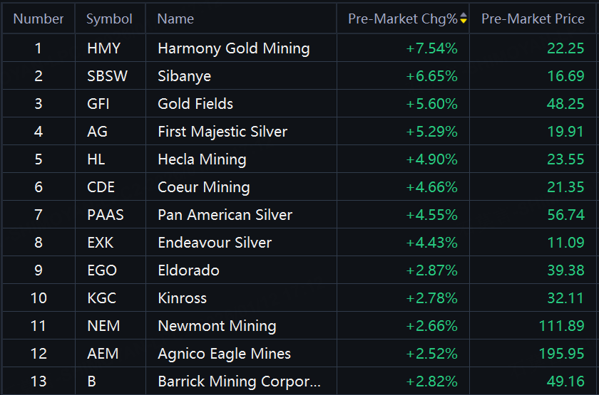 Precious metals shares rallied in premarket trading. Harmony Gold, Sibanye up around 7%; Gold Fields, First Majestic Silver, Hecla Mining up about 5%.