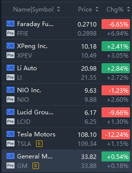 Chinese EV stocks led the sector taking off in premarket trading; Faraday Future Intelligent Electric Inc. soared over 6% while XPeng Inc. gained over 3%.