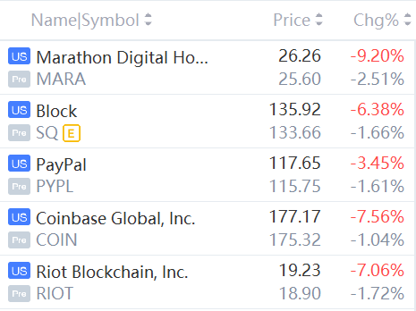 Some Crypto Stocks Dropped in Premarket Trading. Block, Marathon Digital, Riot Blockchain, Paypal and Coinbase fell between 1% and 3%.