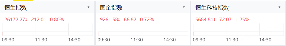 11月18日,港股三大指数低开,恒指跌0.8%,国指跌0.72%,恒生科技指数跌1.25%。