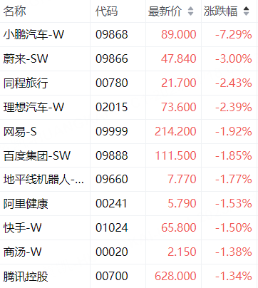 科指成分股中,小鹏汽车-W跌7.29%,蔚来-SW跌3%,同程旅行跌2.43%,理想汽车-W跌2.39%,网易-S跌1.92%。