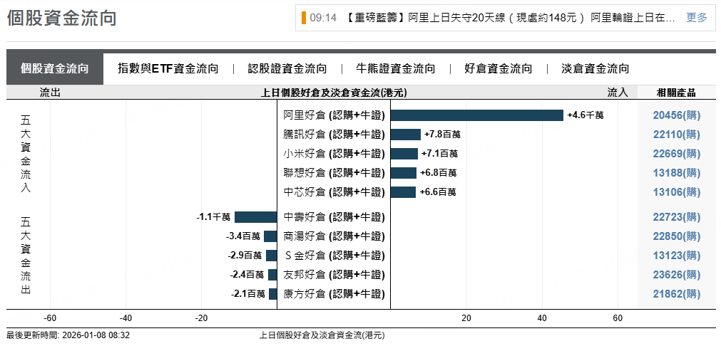 恒指熊證上日流出4000萬元,中壽牛證上日流出670萬元,商湯牛證流出390萬元。
