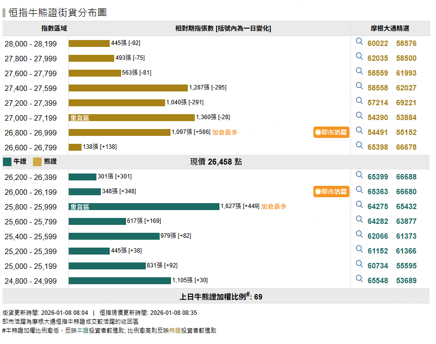 恒指上日高位回落,曾跌穿26500點,資金流反映輪場投資者或傾向進場博反彈,恒指牛 恒指摩通八十牛V.C /熊 恒指摩通八九熊1.P 54491。