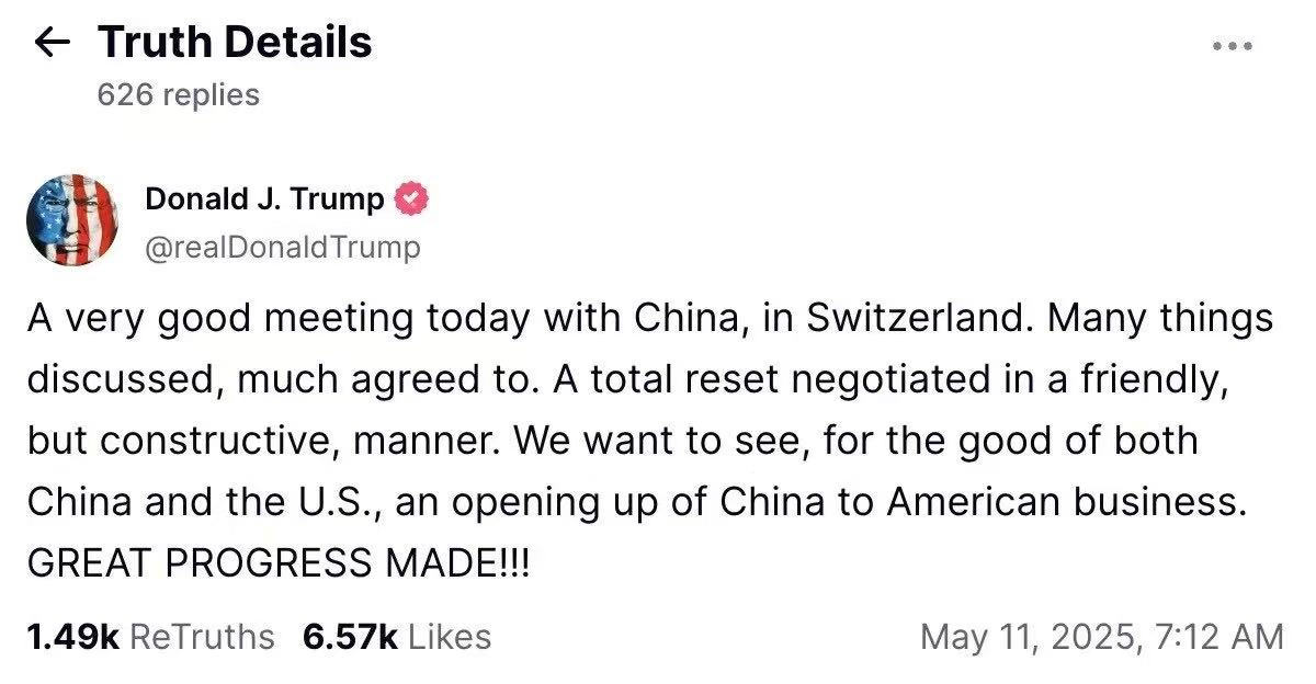 "A very good meeting today with China, in Switzerland. Many things discussed, much agreed to," Trump posted on his Truth Social platform, adding: "We want to see, for the good of both China and the U.S., an opening up of China to American business. GREAT PROGRESS MADE!!!"