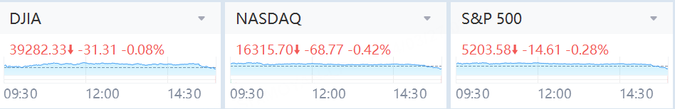 The Dow Jones Industrial Average fell 31.31 points, or 0.08%, to 39,282.33, the S&P 500 lost 14.61 points, or 0.28%, to 5,203.58 and the Nasdaq Composite slid 68.77 points, or 0.42%, to 16,315.70.