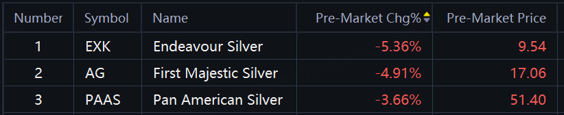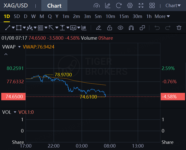 Spot silver fell 4.58% to $74.65 per ounce. Silver shares dropped with Endeavour Silver, First Majestic Silver down about 5%; Pan American Silver down over 3%.