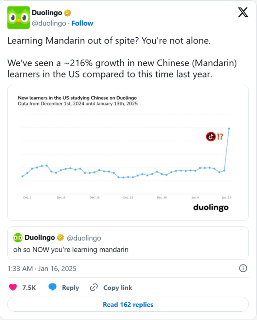 Duolingo wrote on X on Wednesday, "Learning Mandarin out of spite? You're not alone. We’ve seen a ~216% growth in new Chinese (Mandarin) learners in the US compared to this time last year."