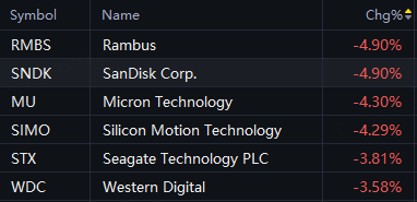 SanDisk, Rambus down 5%; Micron, Seagate, Western Digital down 4%.