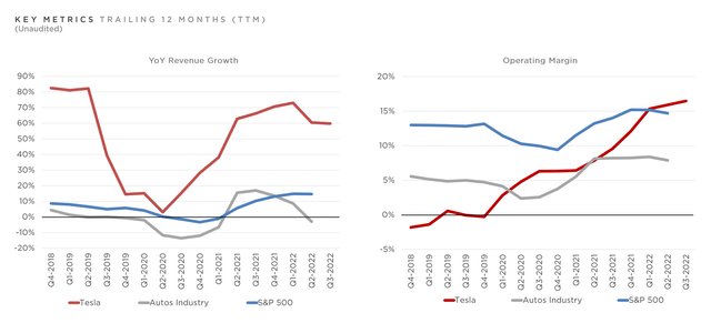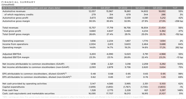 Personally, I disagree with the market consensus that Tesla's Q3 results are bad. From July to end of September, Tesla generated total revenues of $18.69 billion, which compares to $12.06 billion one year prior, and to $14.6 billion in Q2 2022. Thus, Tesla managed to increase revenues by 55% year over year and 28% quarter over quarter. What other company can post such results amidst a clearly slowing global economy?