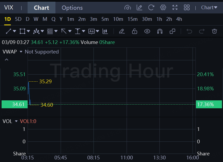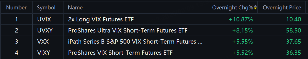 Volatility Index-related ETFs surged in overnight trading. 2x Long VIX Futures ETF rose over 10%; UVXY up over 8%; VIXY, VXX up over 5%.