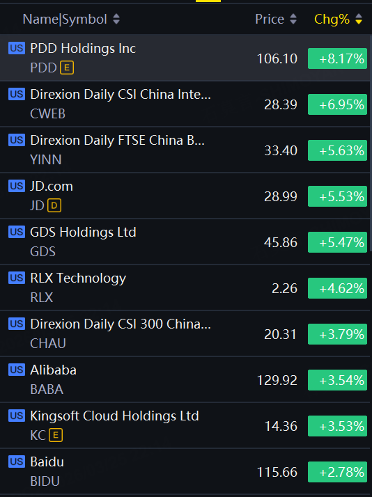 Chinese ADRs & ETFs jumped on Wednesday. PDD up over 8%; CWEB up 7%; YINN, JD.com, GDS Holdings up over 5%; RLX Technology up 4%; Alibaba up over 3%.