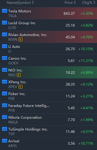 EV stocks rallied in morning trading. Tesla, Rivian, Nio, Li Auto, XPeng, Faraday, Canoo, Arrival and Fisker rose between 2% and 11%.