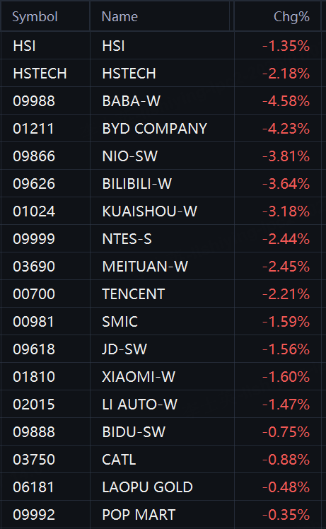 In terms of star stocks, Alibaba fell 5%; BYD, NIO, and Bilibili fell 4%; Kuaishou and Meituan fell 3%; NetEase, Tencent, SMIC, Xiaomi, JD.com, and Li Auto fell 2%.