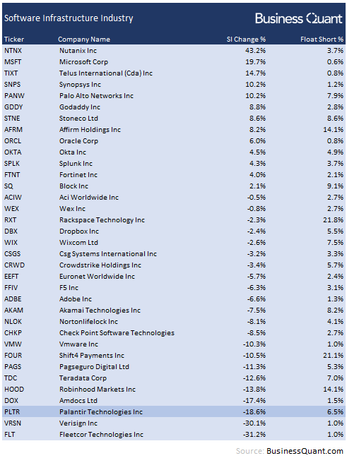 Next, I wanted to see if this short covering was prevalent in the entire software infrastructure industry or if was elevated specifically in Palantir’s case. So, I pulled up the short interest data for 30 other software infrastructure stocks listed on U.S. bourses, that had at least $1 billion in trailing twelve-month revenue. The results were rather interesting. As it turns out, Palantir saw one of the highest levels of short unwinding in the last cycle. This indicates that market participants were far too active with unwinding their short positions in Palantir, than with the other stocks.