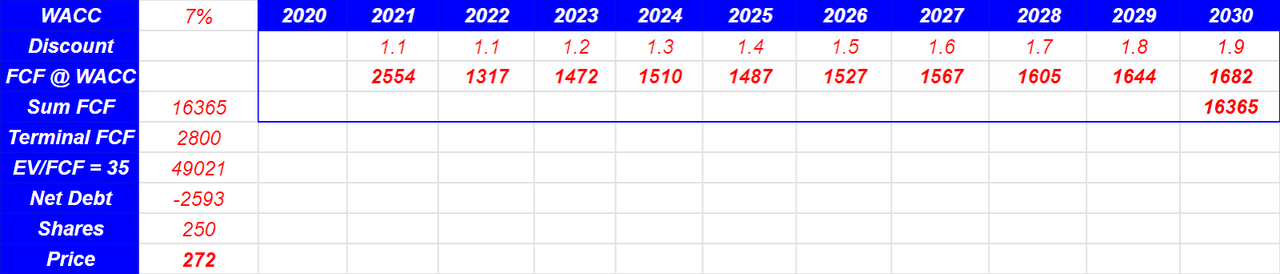 With a WACC of 7%, the sum of the FCF from 2021 to 2030 is equal to $16.3 billion. With a terminal FCF of $2.8 billion and an EV/FCF of 35x, the terminal value is equal to $49 billion. Finally, the implied price stands at $272, which is close to the current valuation of the market.