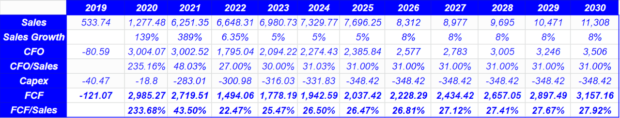 Under the best-case scenario, I included sales growth of 5%-10% from 2023 to 2030. My sales growth is a bit more conservative than the sales growth of market analysts. With CFO/Sales of 27%-31% and capital expenditures of $348 million, I obtained future free cash flow of $1.49-$3.49 billion: