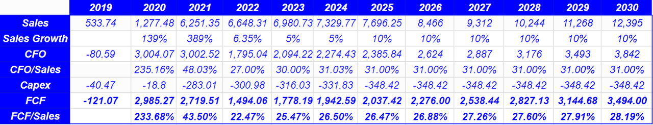 In the worst-case scenario, from 2022 to 2030, Coinbase’s sales would grow at 5%-6.35%, and the free cash flow would grow from $1.4 billion in 2022 to $3.1 billion in 2030: