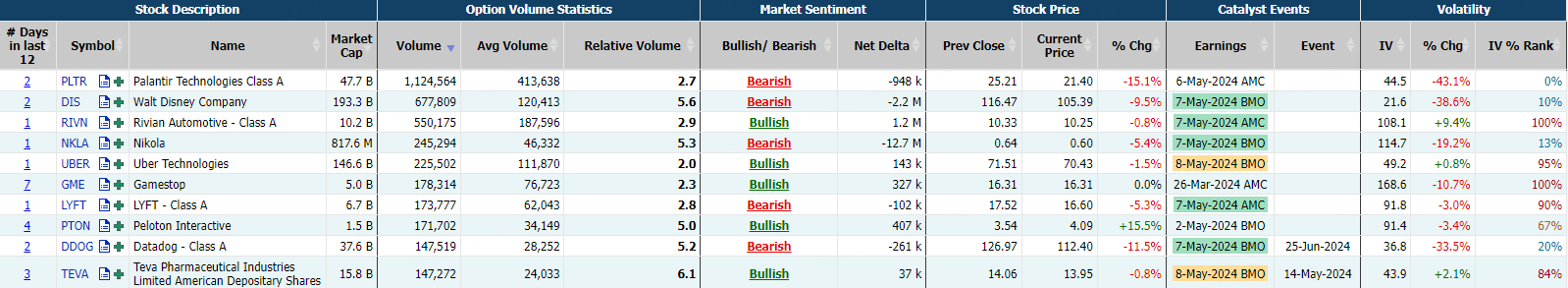 This report shows stocks with the highest volume of bullish and bearish activity by option delta volume, which converts option volume to an equivalent stock volume (bought or sold).