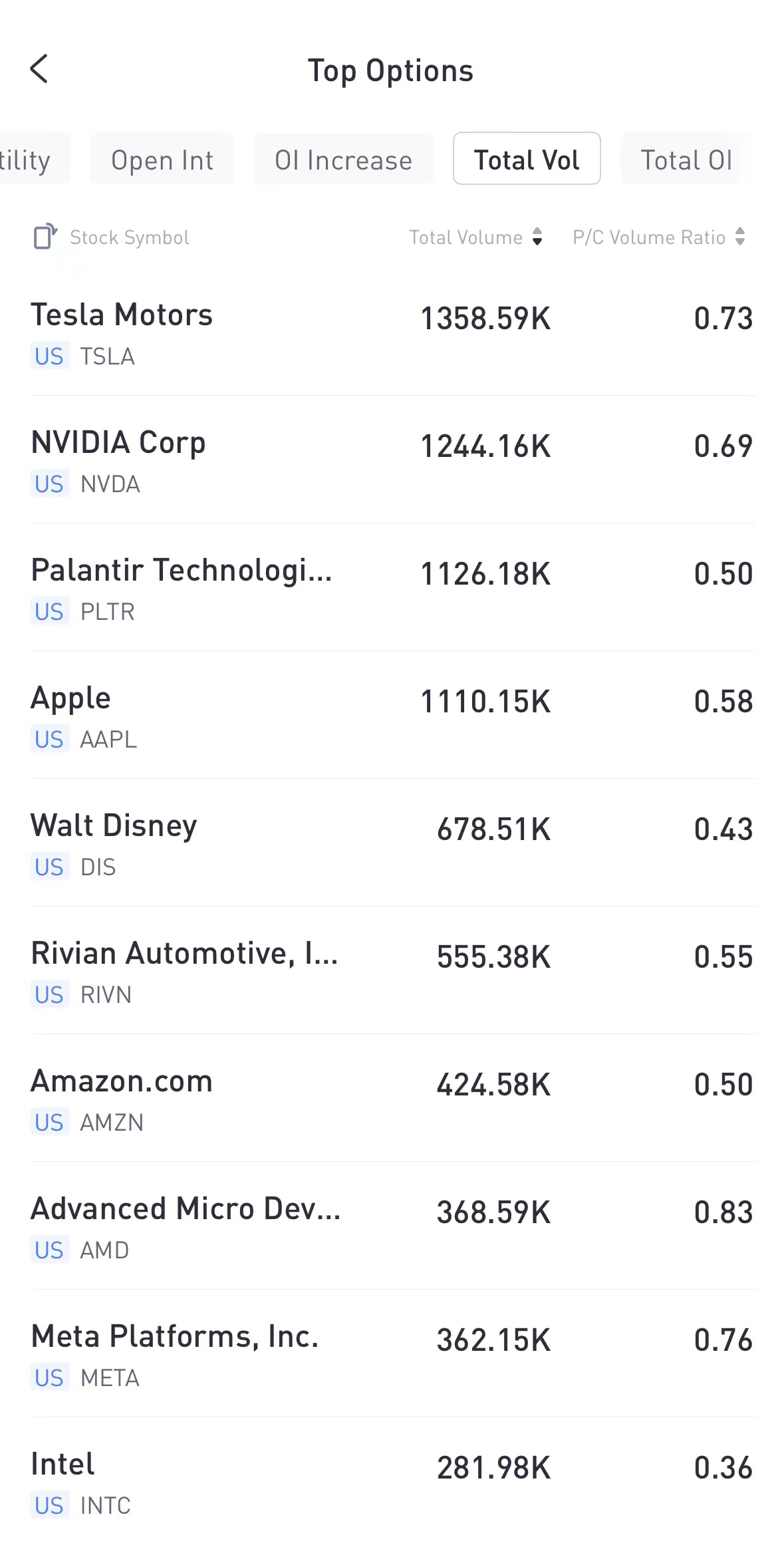 Top 10: TSLA; NVDA; Palantir Technologies Inc. ; AAPL; Walt Disney ; Rivian Automotive, Inc. ; AMZN; AMD; META; Intel