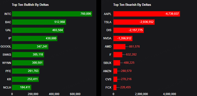 Based on option delta volume, traders sold a net equivalent of -4,739,037 shares of Apple stock. The largest bearish delta came from selling calls. The largest delta volume came from the 10-May-24 182.5 Call, with traders getting short 3,238,460 deltas on the single option contract.$AAPL 20240510 182.5 CALL$