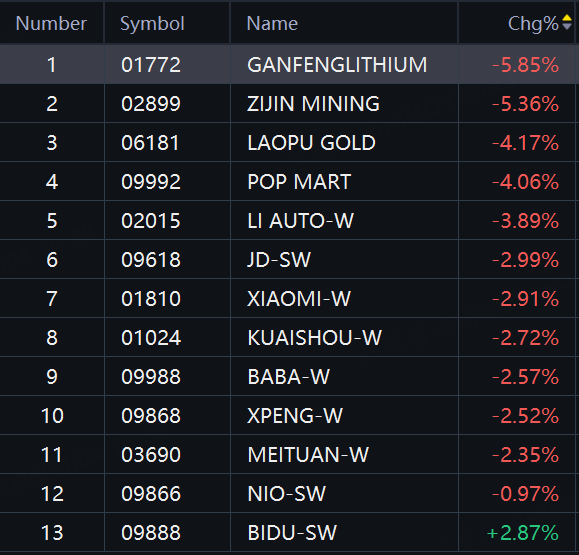 Ganfeng Lithium, Zijin Mining down over 5%; Laopu Gold, Pop Mart down over 4%; Li Auto down over 3%; Xiaomi, Alibaba, Meituan down over 2%.