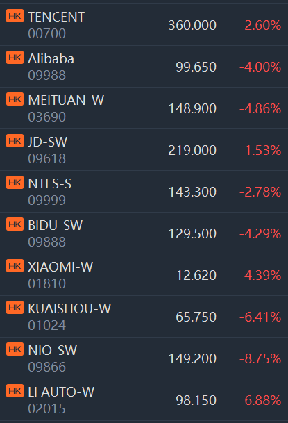 Tencent, Alibaba, Meituan, JD.com, NetEase, Baidu, Xiaomi, Kuaishou and Nio fell between 1% and 9%.