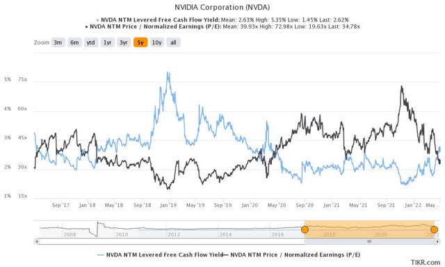 NVDA stock NTM FCF yield % and NTM normalized P/E (TIKR)