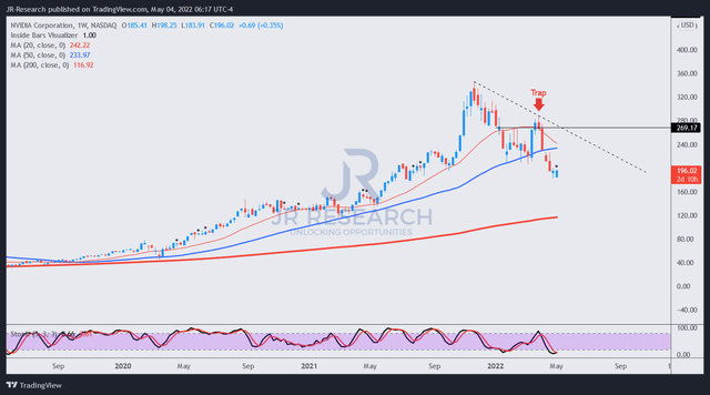 NVIDIA Corporation (NASDAQ:NVDA) stock has been battered after a rapid recovery from its recent March lows. Bullish NVDA investors piled into the stock as CEO Jensen Huang & team introduced its next-gen Hopper architecture for cloud and data center computing. However, the market was also skittish over the weakness in PC end demand, thrashing NVDA stock. As a result, NVDA stock has retraced to its October lows, 43.4% below its November highs.
