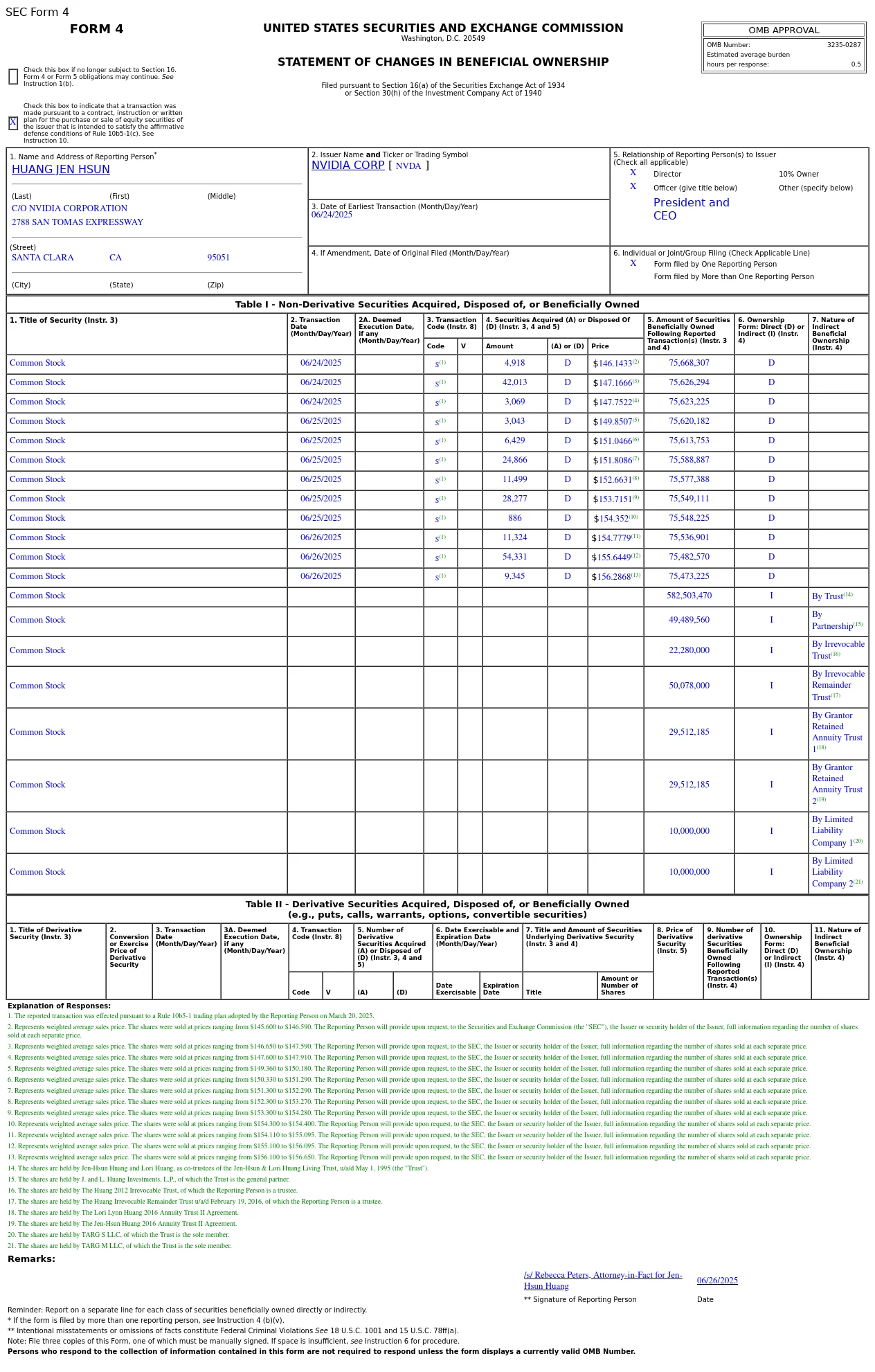 NVIDIA CEO Jen Hsun Huang sold 200K shares of common stock between June 24 and June 26, 2025, at an average price of $152.3271 for a total value of $30.47 million. According to InvestingPro data, these transactions occurred as NVIDIA’s stock traded near its 52-week high of $156.72.