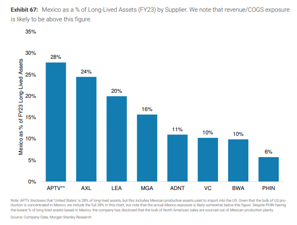 Expect Mexico tariffs to be a topic of significant debate throughout 2025. The greater US auto industry relies dispropor-tionately on Mexico for parts/supply sourcing as a highly developed low-cost auto supply complex. According to the US Census Bureau, Mexico is estimated to export $143bn of auto-related products to the US in FY24 (out of a total close to US$ 500bn). This includes every-thing in the autos value chain (complete vehicles, parts and bat-teries). For reference, APTV has 35 manufacturing plants and 3 technical centers in Mexico (and is one of the country’s largest pri-vate employers), ~30% of LEA’s employees are based in Mexico, and ~40-50% of AXL’s revenue is generated out of its Mexican facilities. PHIN also discloses that 90%-95% of North American OE sales are produced in Mexico.