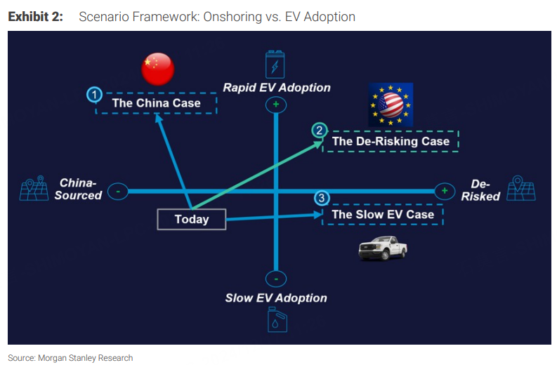 The China Case: EV adoption progresses in the US with con-tinued dependence on a China-dominated battery supply chain. This is the least-likely scenario in our opinion.