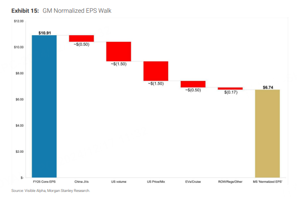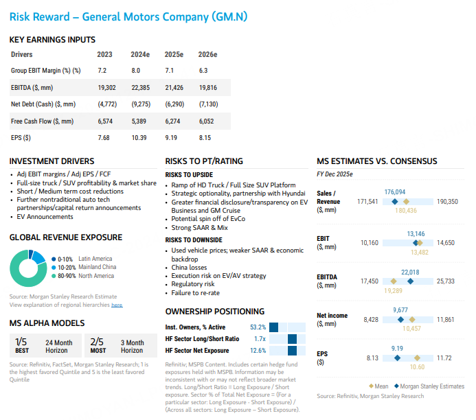 We raise our GM price target to $54 (from $46 previously) while raising our bull case to $80 ($72 prior), and bear case to $36 ($32 prior). Upgrade to EW. The target increase is driven by a higher assumption of normalized EPS to $6.74 (from $5.45 previously) as we roll forward to year-end FY25 share count and lower the effective tax rate (22%). In addition, our normalized forecasts back in improved annual losses from China JVs ($0.2bn vs. $0.5bn previously) and a lower expectation of losses at Cruise ($0.5bn vs. $1bn prev) due to expected strategic/structural actions to address losses in the unit. Our normalized earnings forecast assumes BEV margins of negative 10% (approx. $2bn of losses per year). At the same time, our normalized EPS assumption assumes sustainable 12% EBIT margins for GM's ICE trucks/full-sized SUVs and 5% margins for GM's ICE cars and crossovers. Our target PE multiple applied to normalized earnings is 8x which compares to the company's long-term historical PE multiple of 7.1x.