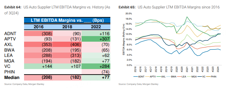 In a standard year, the OEMs push their suppliers, many of whom sell more commoditized products, to give them gradual price-downs in order to support their own margins and offset rising labor and fixed costs. The suppliers sought to combat this downward price trend by 1) shifting their portfolios to less-commoditized, higher value-added product lines (ECU's, ADAS, adding heating/massage to seating, etc.); 2) increasing automation; 3) l abor arbitrage/moving labor to increasingly low-cost countries (US > Mexico > Central America, for example). However, even though these strategies have offset some of the impact from OEM price-downs and other cost inflation, most suppliers have seen their margins gradually contract over the past decade. Since 2016, the median US supplier has experienced a ~200bps EBITDA margin contraction.