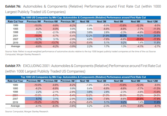 We note that in looking at the prior 6 rate cutting cycles, 2001 stands out as a positive outlier… Excluding the 2001 cycle where the market was dragged lower predominately by inflated technology stocks, results are even more mixed, with underperformance on average following the first month after a rate cut. While every rate cycle is highly unique (historical average performance cannot be taken at face value), we do not see rate cuts as a material catalyst for near-term autos outperformance.