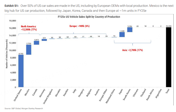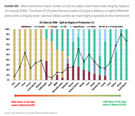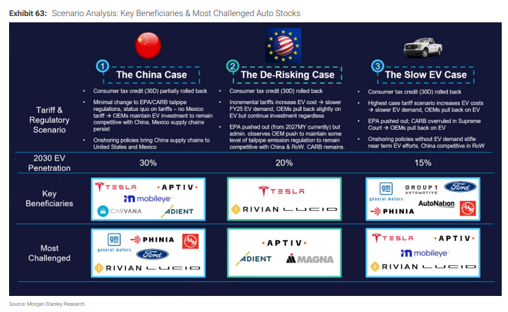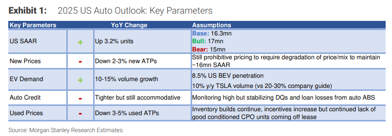 Policy changes present near-term headwinds to US EV sales but must not cede autonomous leadership to geopolitical rivals. Morgan Stanley see US SAAR >16mm supported by lower rates but higher competition with tariff hikes are an inflationary wild-card. Prefer dealers to suppliers and reiterate TSLA as Top Pick.