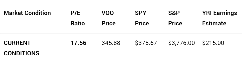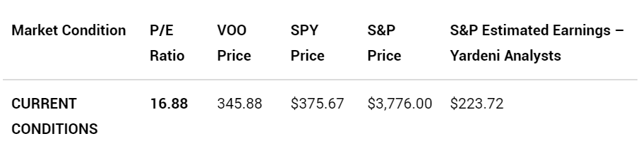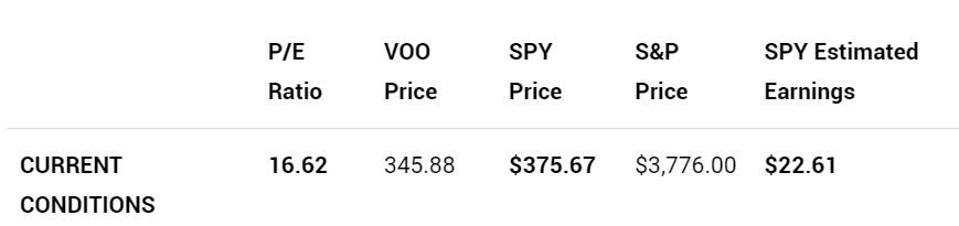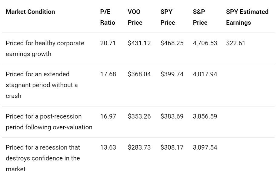 Based on the analysts' estimates that SPY's earnings for 2022 will come in at $22.61 we come up with these prices for VOO, SPY, and the S&P 500 that would generate the P/E ratios that prevailed during periods when the market displayed the following conditions: