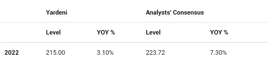 The report available online as I write this was just published on October 3, 2022, which is as fresh as you are going to get. I therefore give it more credence than forecast found in Fastgraphs. Here are Yardeni and Analysts' forecasts as reported in this most recent YRI S&P 500 Forecast report.