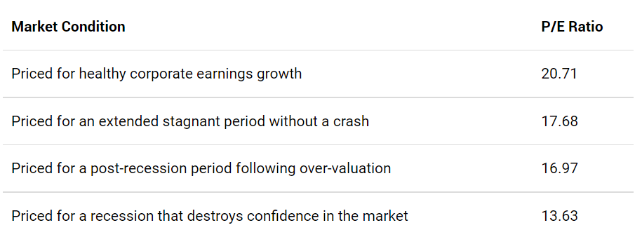 These are the four different Price/Earnings ratios that prevailed during four periods selected from the past 20 years that experienced very different market conditions: