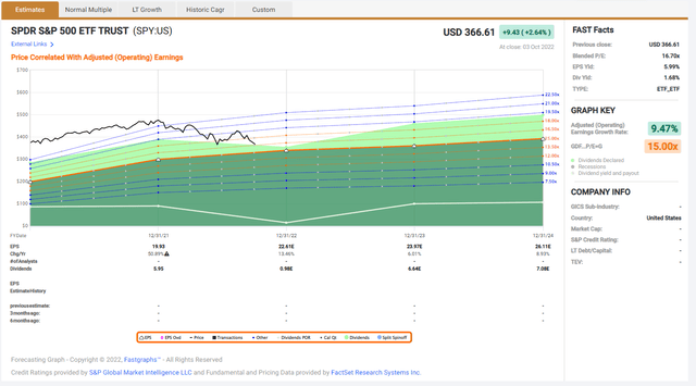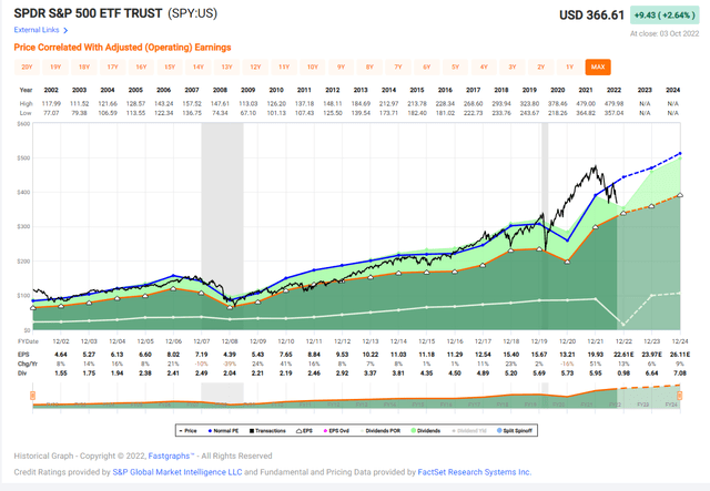 Since I wrote that January article, Fastgraphs is no longer reporting data for the S&P 500, due, I was told, to the exorbitant price S&P Global charges for the index data for that single index. Instead, Fastgraphs now reports data for the SPDR S&P 500 Trust ETF (NYSEARCA:SPY) which it claims performs in a manner similar enough to the S&P 500 to be used for analyses based on it.