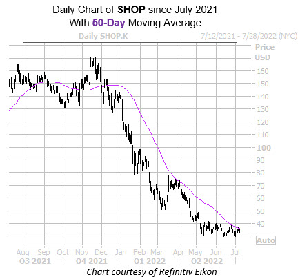 On the charts, the stock has been middling between the $30 and $40 levels since mid-May, though it did secure a July 5, two-year low of $29.72. The 50-day moving average has pressured shares lower for most of the year thus far, though the security's relative strength index (RSI) of 19.6 stands firmly in "oversold" territory, meaning a short-term bounce is overdue. Year-to-date, SHOP is down 76.6%.