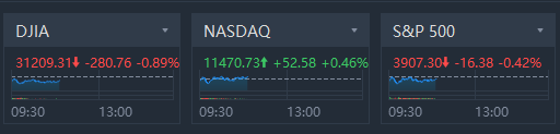 U.S. stocks mixed in morning trading. Nasdaq rose 0.46%, while Dow Jones, S&P 500 lost 280.76 points and 16.38 points separately.
