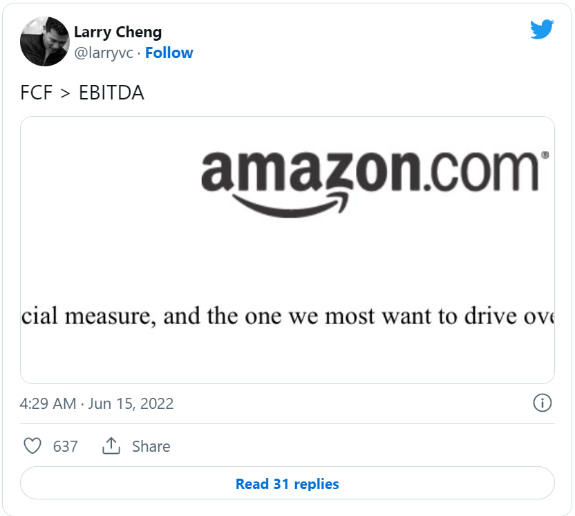 In the tweet, Cheng brought up a statement from Amazon to its shareholders indicating that free cash flow per share is the most important metric to watch.