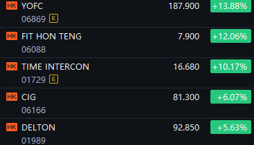 HK Optical Communication Stocks Jump. YOFC up 14%; Fit Hon Teng up 12%; Time Intercon up 10%; CIG and Delton up 6%.