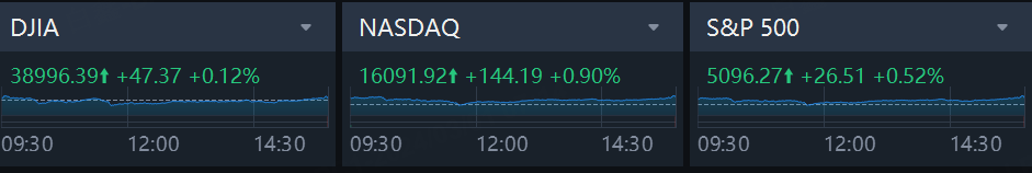 The Dow Jones Industrial Average rose 47.37 points, or 0.12%, to 38,996.39, the S&P 500 gained 26.51 points, or 0.52%, to a record closing high of 5,096.27. The Nasdaq Composite gained 144.18 points, or 0.90%, to end at a peak of 16,091.92. Its previous record close was 16,057.44, hit in November 2021.