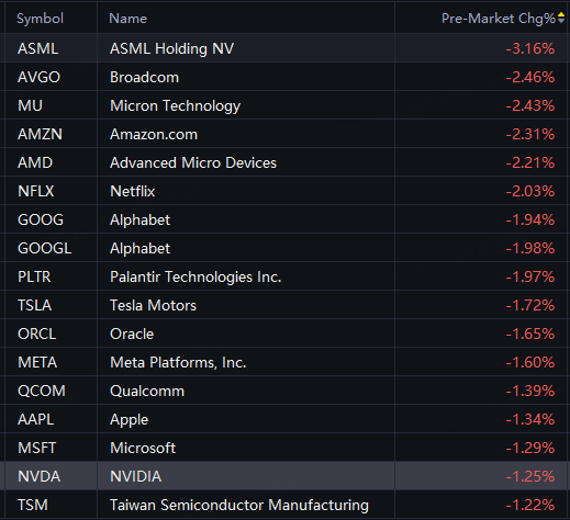 Big tech stocks fell in premarket trading on Monday. ASML down 3%; Tesla, Amazon, Alphabet, Micron, Meta down 2%; Nvidia, Microsoft, Apple down 1%.