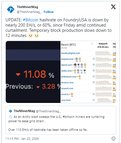 The Bitcoin network is experiencing a significant slowdown as Winter Storm Fern sweeps across the United States, forcing major mining operations to go dark. Foundry USA, the world’s largest mining pool, has seen its hashrate plummet by approximately 60% since Friday, with nearly 200 EH/s taken offline.