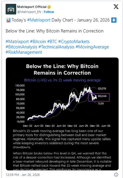 Despite a brief relief rally in late December, BTC encountered heavy resistance at this average and has since pulled back. Analysts warn that while short-term tactical bounces are possible, there are currently no clear signals to support a sustainable upward move, advising investors to remain cautious until the price can firmly re-establish itself above this long-term support.