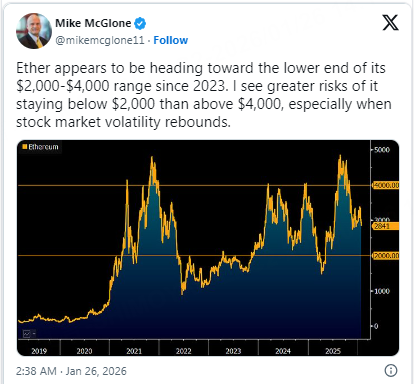 Bloomberg Intelligence’s senior commodity strategist, Mike McGlone, has issued a cautious outlook for Ethereum (ETH), suggesting the asset is more likely to slide toward $2,000 than return to the $4,000 mark. In a recent analysis, McGlone noted that ETH appears to be gravitating toward the lower bound of the trading range it has maintained since 2023. He highlighted that if traditional stock market volatility returns to historical norms, risk assets like Ethereum could face significant pressure.