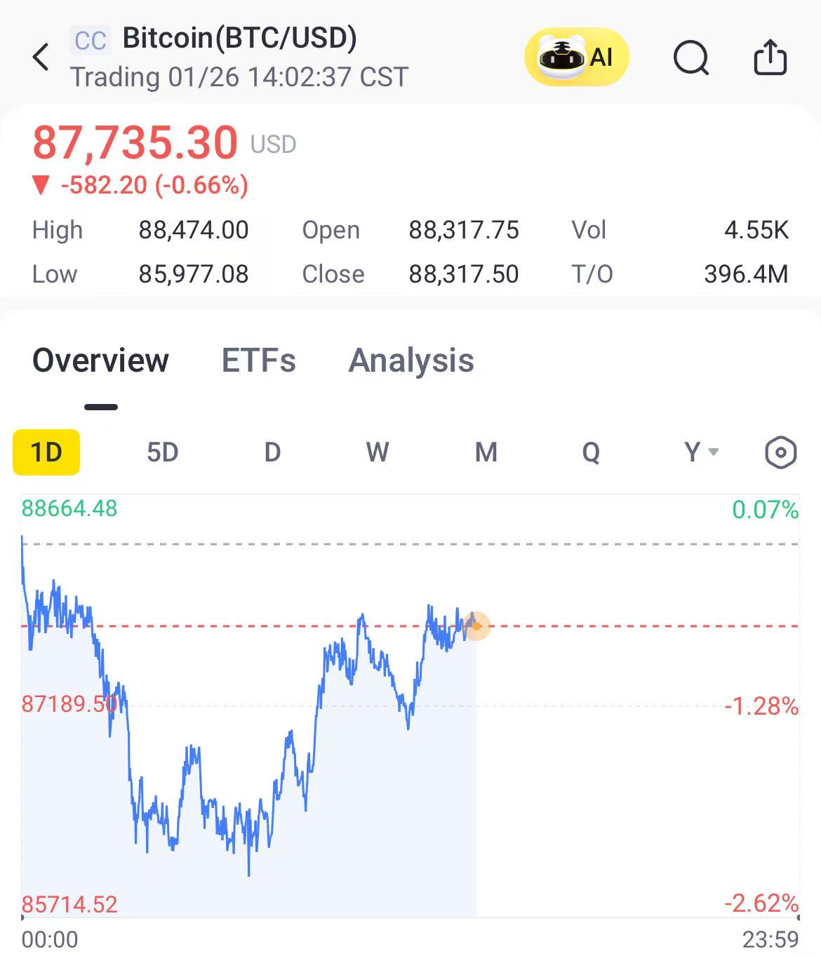 Bitcoin dropped as much as 3.5% Sunday to a 2026 low of just above $86,000 before climbing to $87,735 Monday. Second largest token Ether slumped as much as 5.7% before rallying 2% to trade at $2,872, still close to its lowest level since mid December.