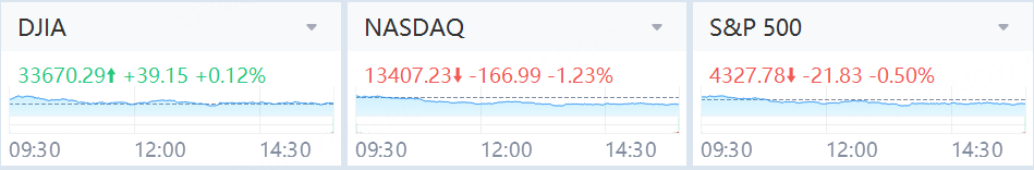 The Dow Jones Industrial Average rose 39.15 points, or 0.12%, to 33,670.29, the S&P 500 lost 21.83 points, or 0.50%, to 4,327.78 and the Nasdaq Composite dropped 166.99 points, or 1.23%, to 13,407.23.